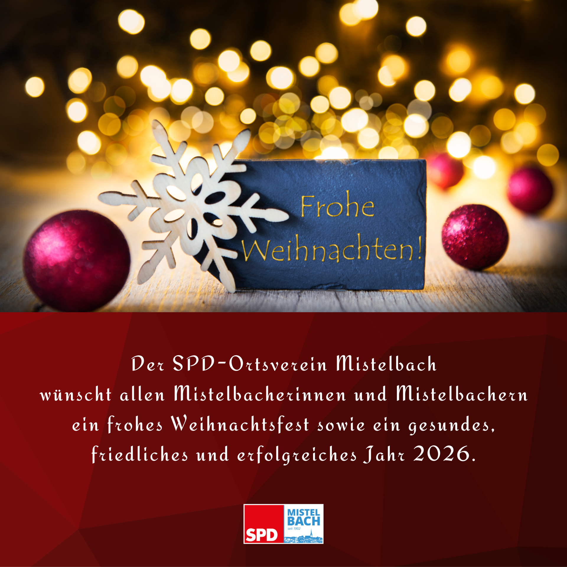Zum Weihnachtsfest 2025 ist die 151. Ausgabe unserer Ortsvereins-Zeitung "Mistelbach Aktuell" erschienen. Darin blicken wir zurück auf das Jahr 2025 in unserer Gemeinde unter dem Motto "das Jahr der Planungen". Auch ein Rückblick über Aktivitäten unseres Ortsvereins warten auf die Leserinnen und Leser. Auch die Zukunft