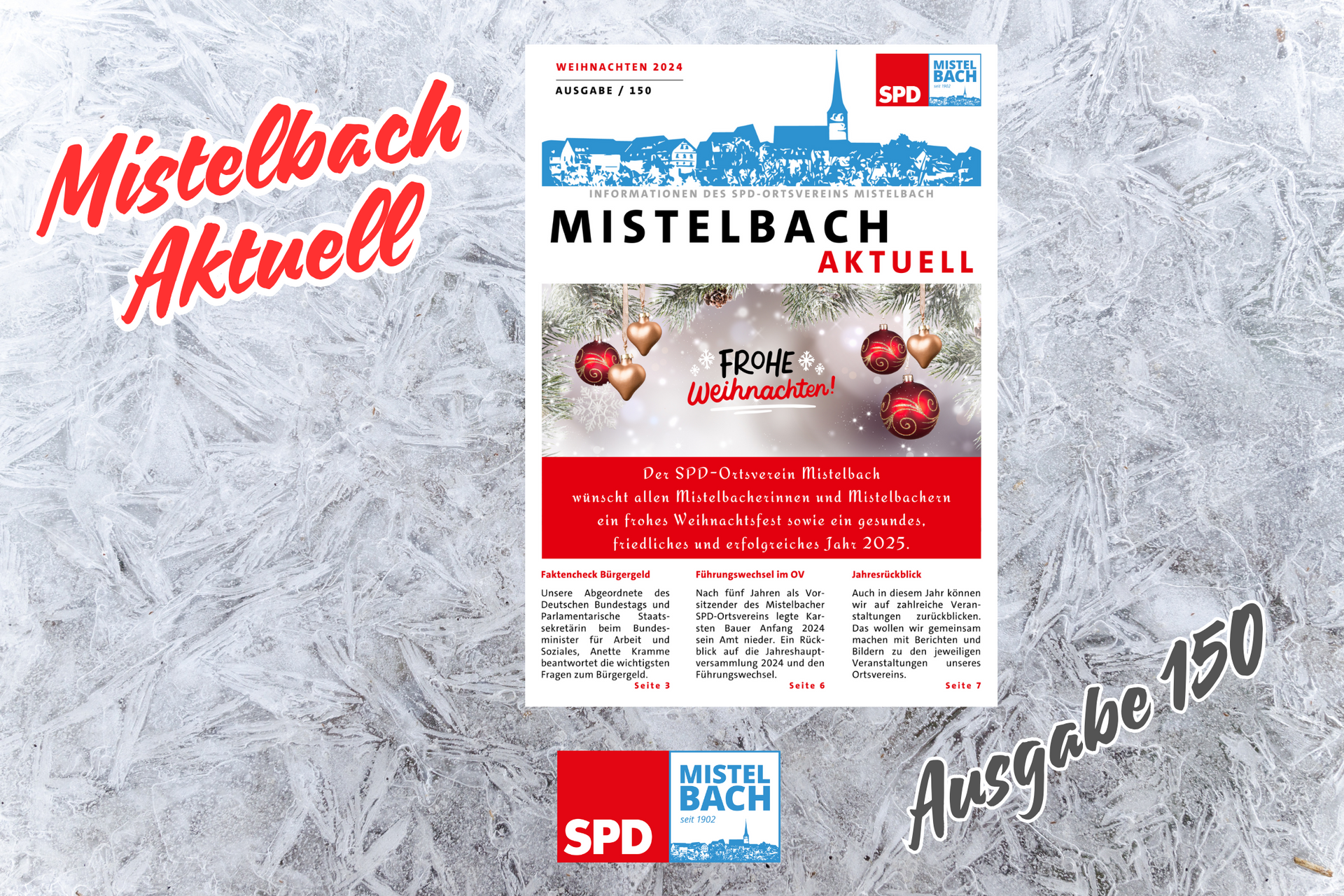 Zum Weihnachtsfest 2024 ist die 150. Ausgabe unserer Ortsvereins-Zeitung "Mistelbach Aktuell" erschienen. Darin geht es unter anderem um einen Faktencheck zum Bürgergeld von MdB Anette Kramme, den Führungswechsel in unserem Ortsverein zu Beginn des Jahres und einen Rückblick über unser Jahr 2024.