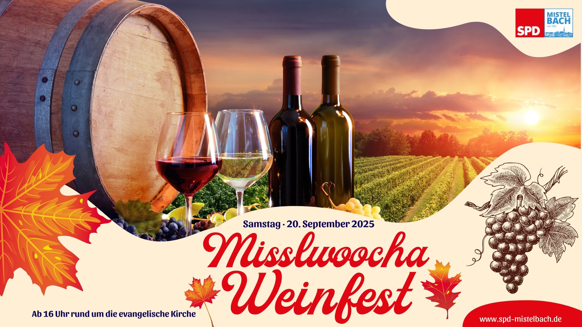 Der Herbst hält Einzug – und mit ihm eine schöne Tradition: Am Samstag, den 20. September 2025, lädt der SPD-Ortsverein Mistelbach herzlich ein zum Misslwoocha Weinfest rund um die evangelische Kirche (Pottensteiner Str. 1)!